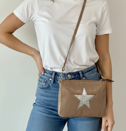 Sac bandoulière ajustable avec motif brillant en forme d’étoile.